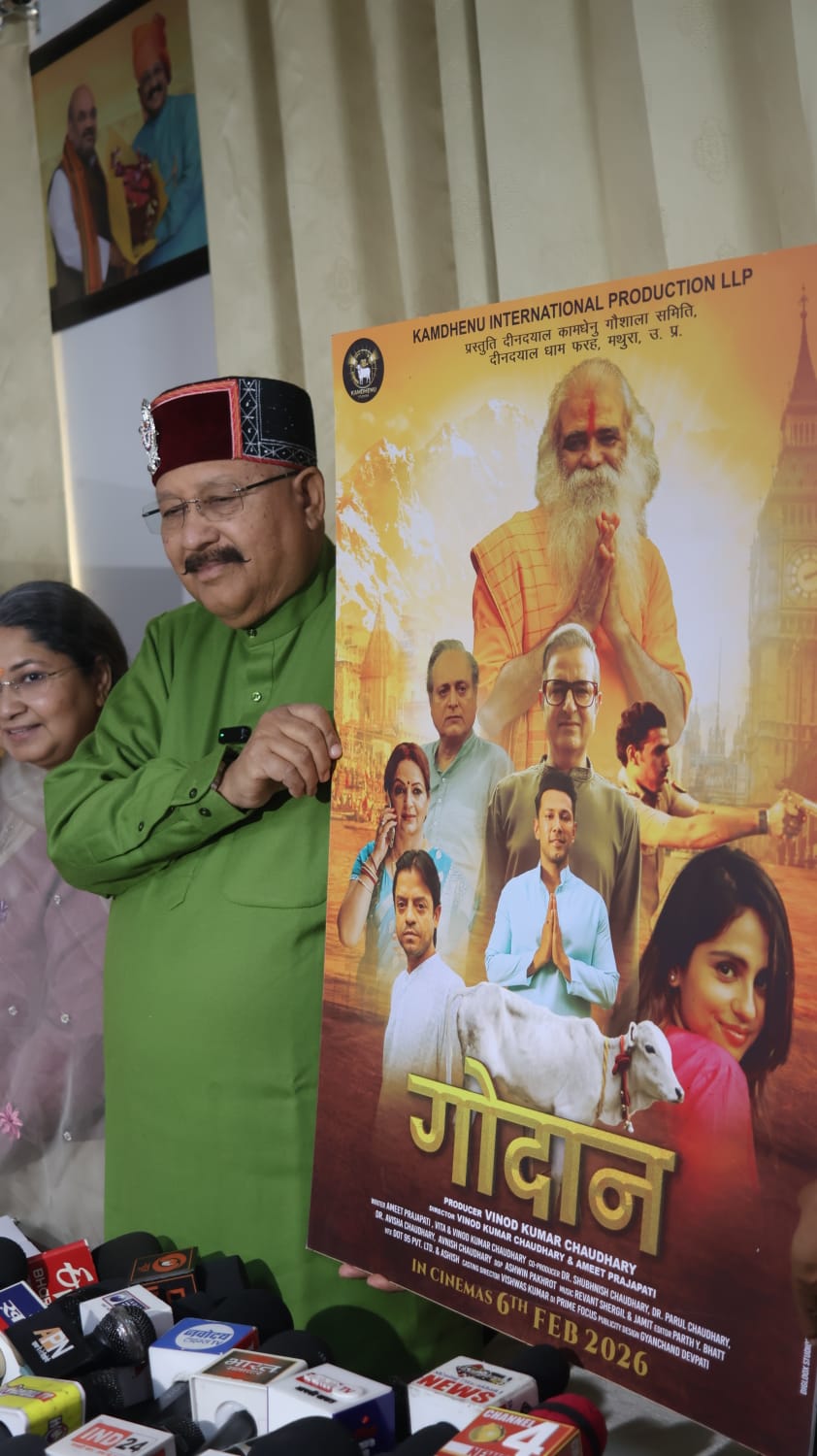 न्होंने फिल्म निर्माण के लिए पूरी टीम को बधाई देते हुए कहा कि बॉलीवुड फिल्म इंडस्ट्री इन दिनों बदलाव के एक बड़े दौर से गुजर रही है। अब यहाँ की फिल्में केवल पारंपरिक, पारिवारिक कहानियों तक सीमित नहीं हैं, बल्कि फिल्म निर्माता और निर्देशक अब सामाजिक मुद्दों से लेकर सस्पेंस-थ्रिलर जैसे अलग-अलग और लीग से हटकर विषयों पर फिल्में बना रहे हैं। धर्मस्व एवं संस्कृति मंत्री श्री महाराज ने कहा कि भारतीय संस्कृति और सनातन धर्म में गौमाता की अहमियत को समझाने के लिए विनोद चैधरी के निर्देशन में बनी फीचर फिल्म ‘गोदान’ 6 फरवरी 2026 से पूरे देश के सिनेमाघरों में प्रदर्शित होने वाली है। ष्गोदानष् फिल्म को वैज्ञानिक नजरिये के साथ प्रस्तुत कर फिल्म के निर्माता निर्देशक, कलाकारों और गेस्ट ने समाज को एक बड़ा मैसेज देने का काम किया है। यह फिल्म केवल किसी व्यक्ति विशेष के लिए नहीं, बल्कि देश के युवाओं को अपनी संस्कृति और सनातन मूल्यों से जोड़ने का एक मजबूत जरिया है। श्री महाराज ने कहा कि उनका विश्वास है कि अगर गौ हत्या जैसे अपराधों में शामिल लोग एक बार इस फिल्म को देख लें, तो उनका हृदय परिवर्तन अवश्य होगा।