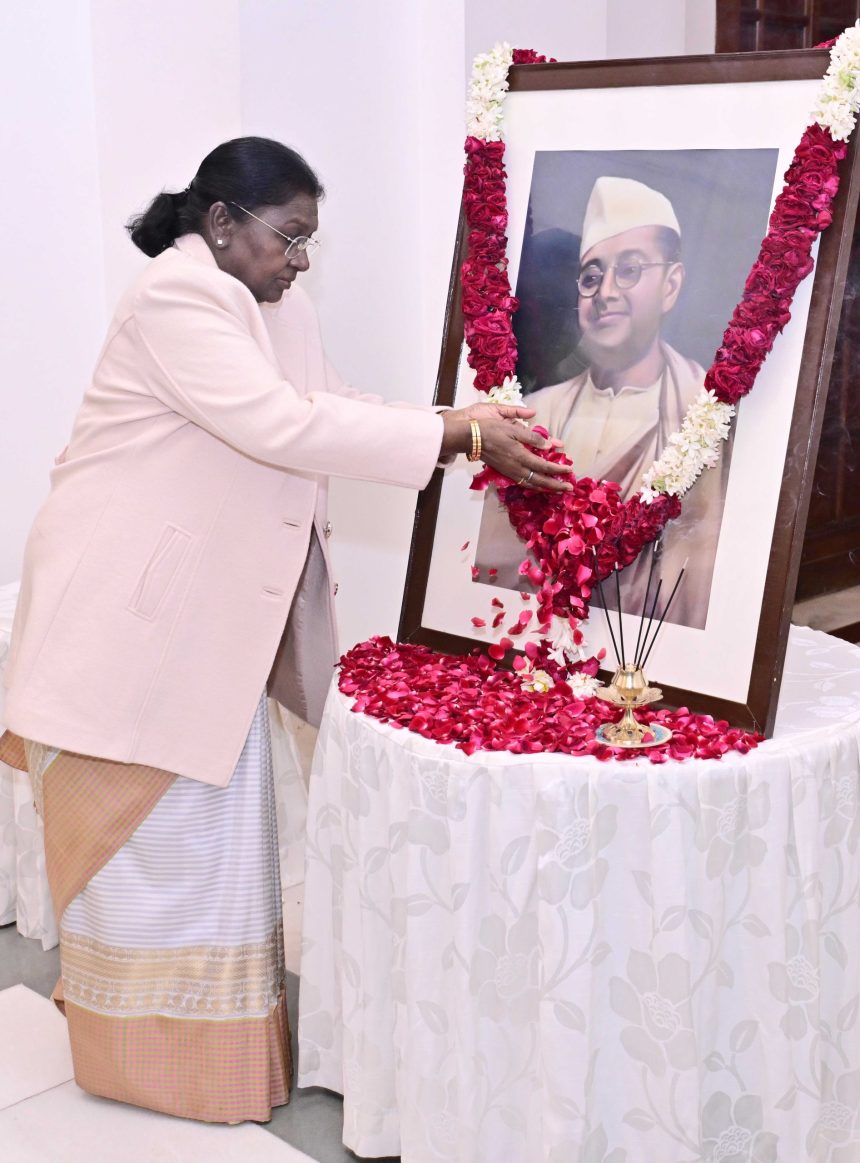 भारत की राष्ट्रपति श्रीमती द्रौपदी मुर्मू ने आज (23 जनवरी, 2026) को नेताजी सुभाष चंद्र बोस की जयंती, जिसे पराक्रम दिवस के रूप में मनाया जाता है, के अवसर पर राष्ट्रपति भवन में उन्हें पुष्पांजलि अर्पित की।
