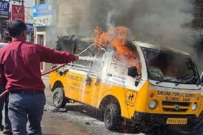 ड्रोन पब्लिक स्कूल की वैन में लगी आग, चारों ओर अफरा-तफरी