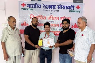 विकसित जीवन के रक्तदान शिविर में कुल 28 युवाओं ने किया रक्तदान रेडक्रास के डॉ. अनिल वर्मा को विकसित जीवन रक्त भूषण अवार्ड